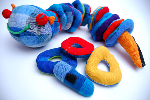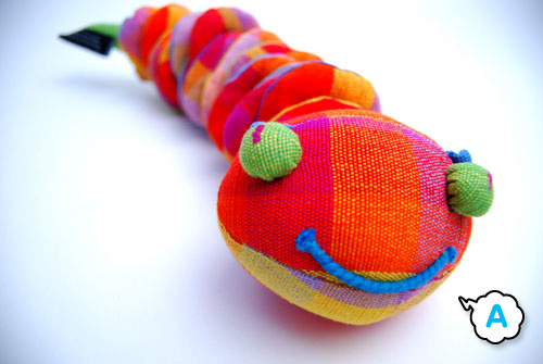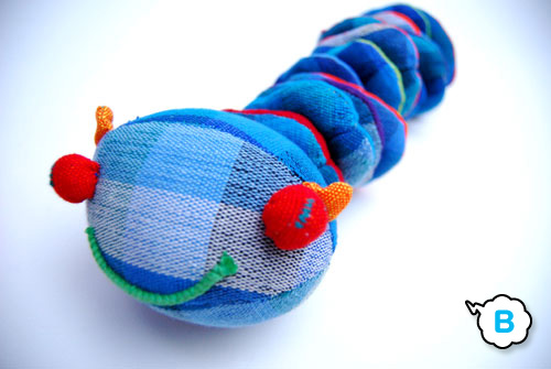 ベアフット特有の色鮮やかな、いもむしくんのぬいぐるみになります。