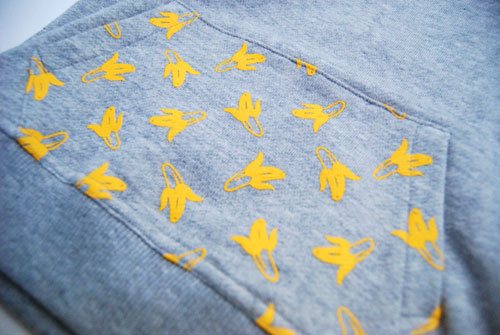 バナナに貼っているシールをイメージさせるイラストや、ポケット部分のバナナイラストが