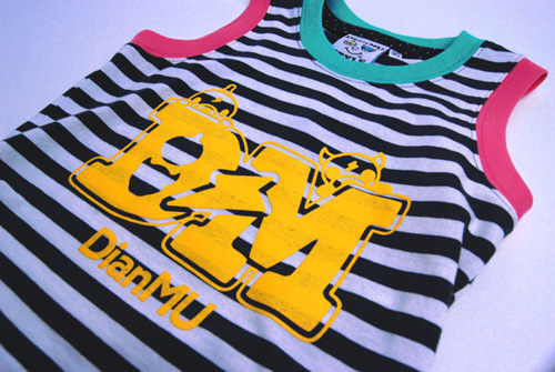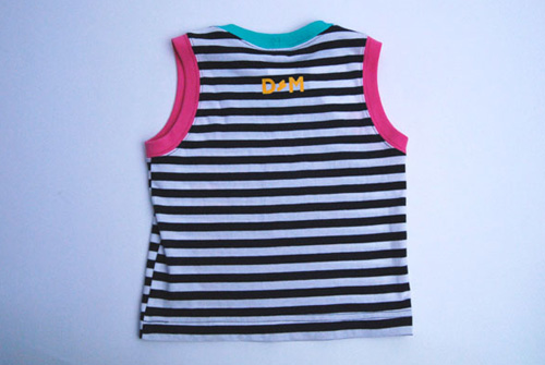 ホワイト×ネイビーのボーダー柄にカラフルなリブやプリントをした、色合い鮮やかなタンクトップになります。