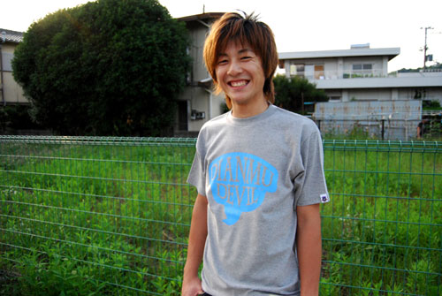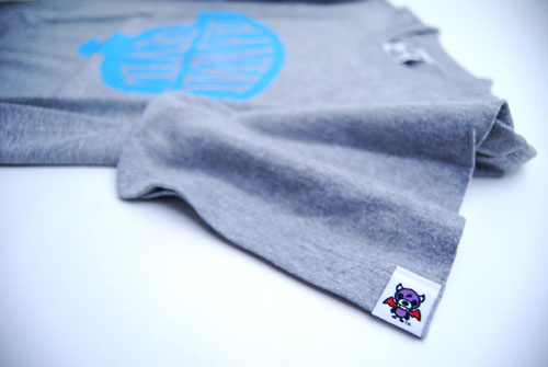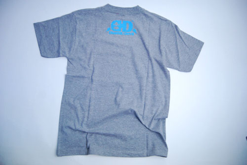 グレーのボディに水色プリントと、配色の組合せが面白いTシャツです。